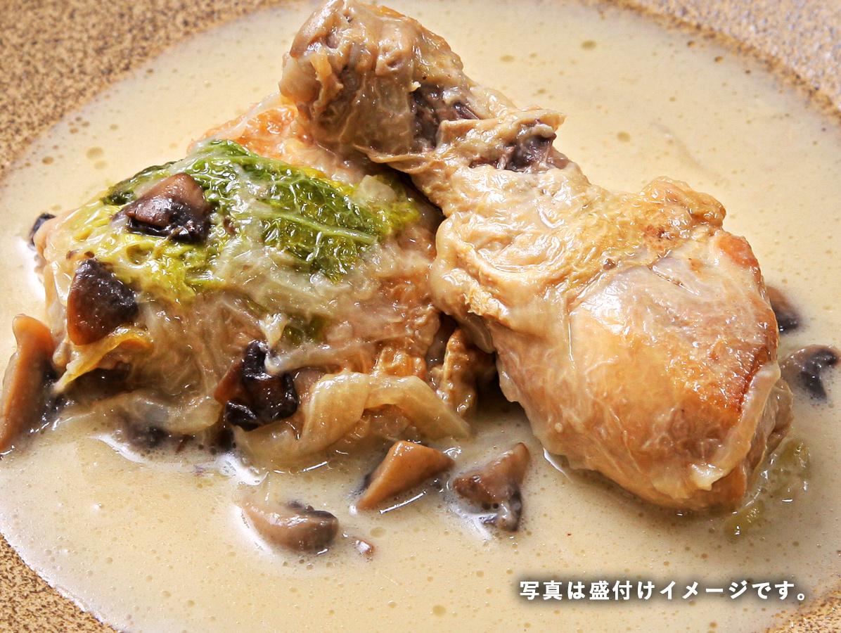 | 料理説明 | マリネした骨付の鶏もも肉に焼き色をつけ ブイヨン・クリーム・シャンピニオンで煮込んだ料理です。 |